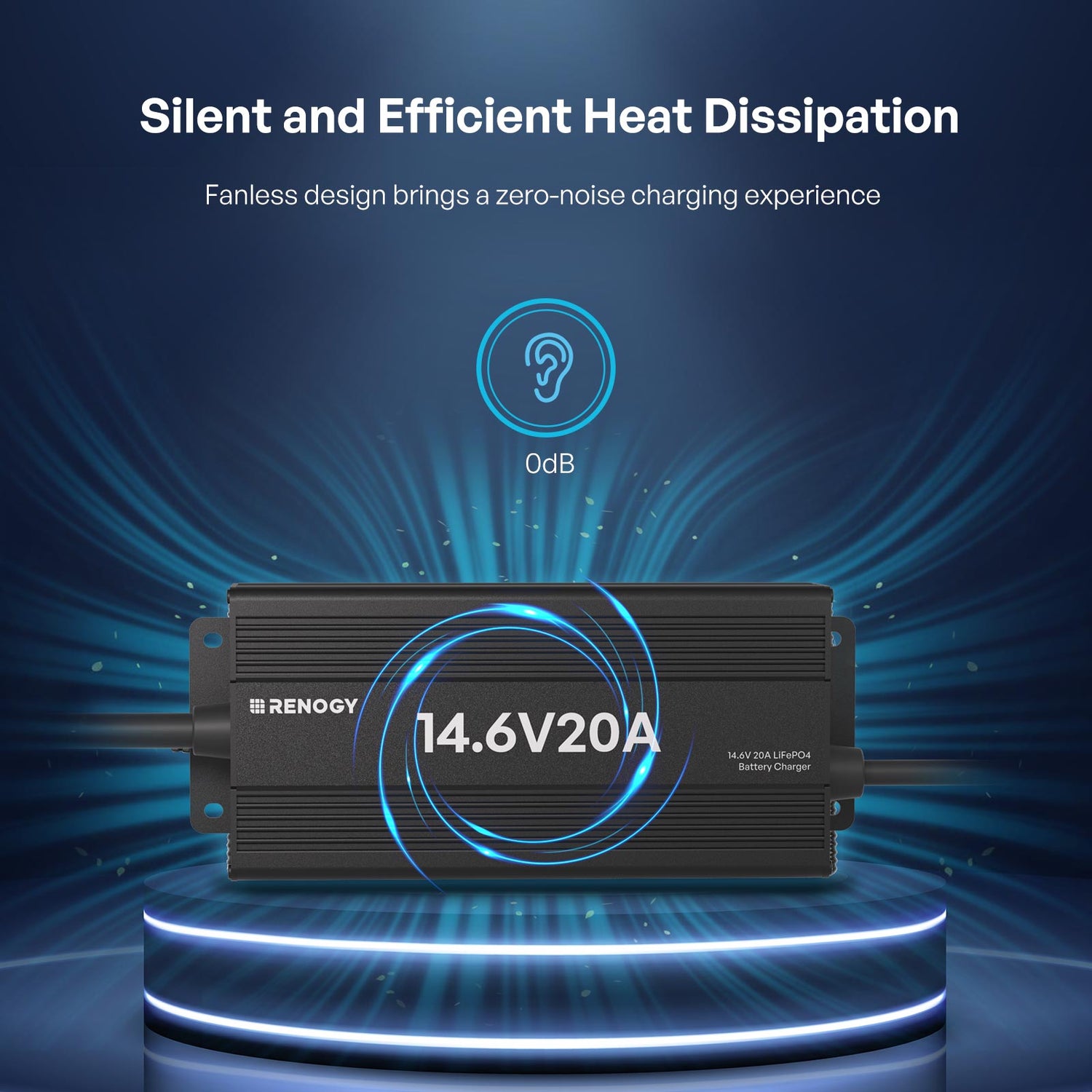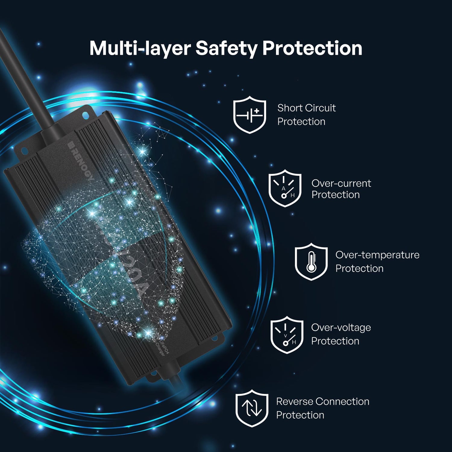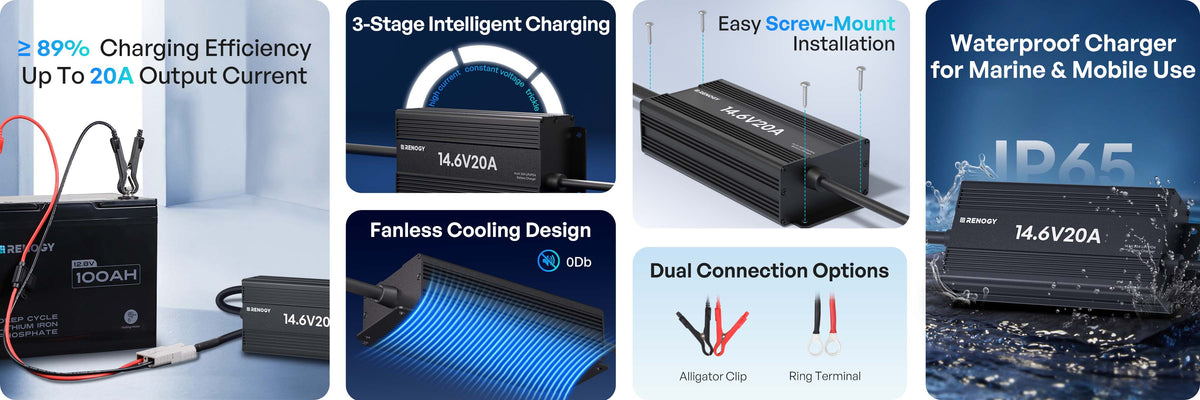 Renogy 12V 20A AC charger is designed for LifePO4 Battery. The charger has a 3-stage intelligent charging design (CC/CV/trickle) to ensure it charges the lithium battery quickly and efficiently. This battery charger has 5-layer protection functions to realize comprehensive monitoring and protection of the battery. This charger is suitable for RVs, motorbikes, boats, and camper-van.