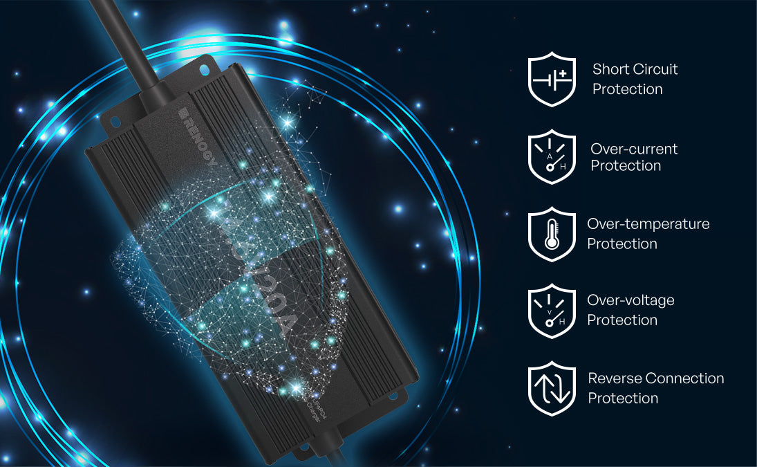 Built-in protections guard against short circuit, over-current, over/under voltage, and reverse polarity, ensuring safe and reliable charging.