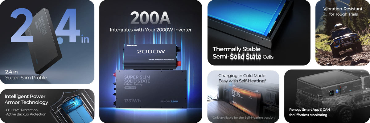 Renogy 12V 104Ah Super Slim solid battery can discharge at max. 200A (2C), considering 104Ah capacity. This means one singe battery is able to work with a 2000W inverter for powering your esential appliances through your tough adventures.