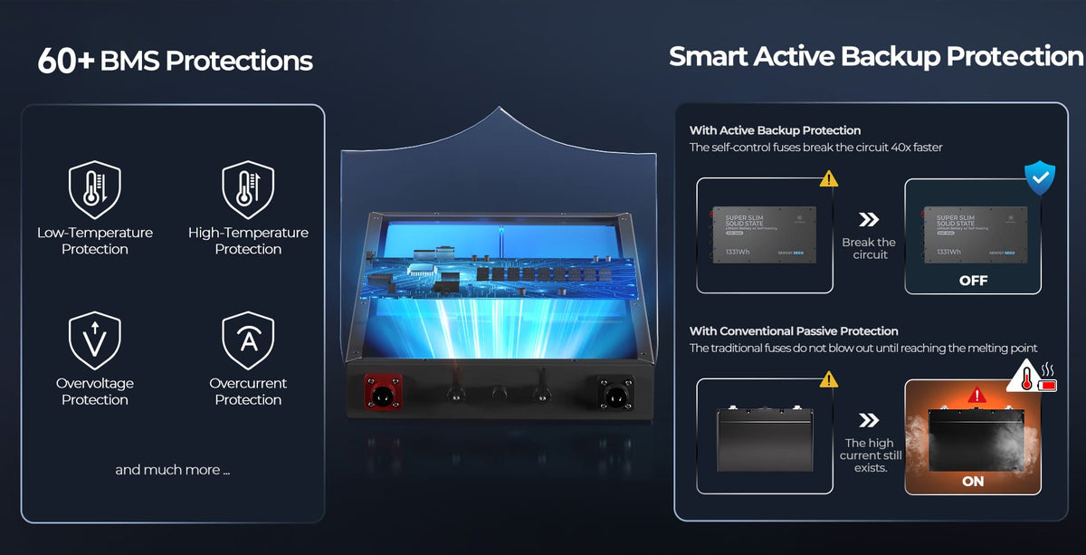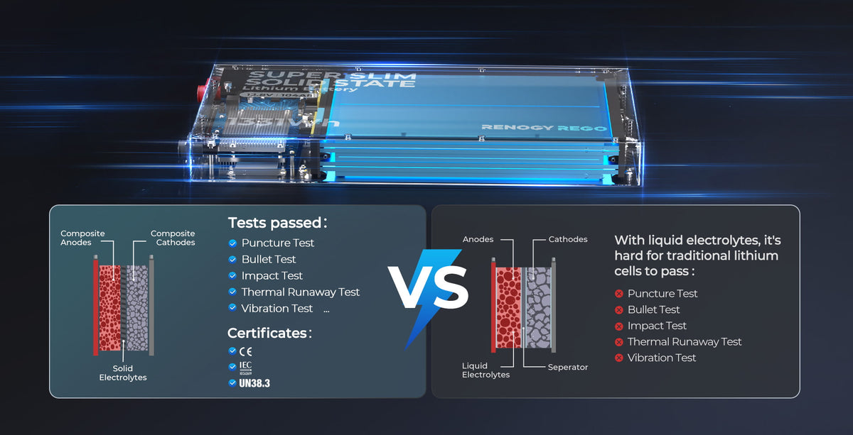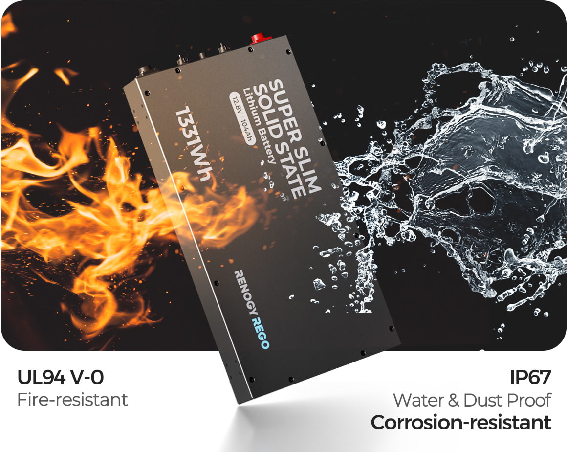 When the off-road life calls, the Renogy Slimline LiFePO4 battery is ready to answer. Its rugged IP67-rated enclosure protects against dust, water, and the elements, so you can confidently tackle any terrain. The added UL94 V-0 fire-resistant rating provides critical safety, letting you focus on the thrill of the adventure.