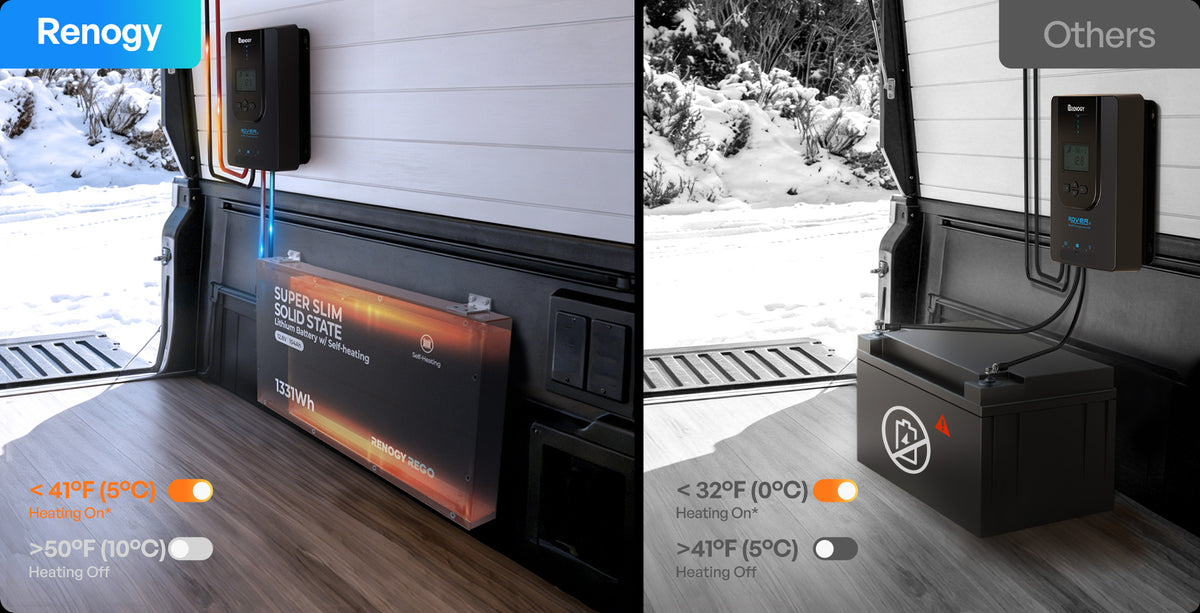 Designed specifically for cold weather, REGO super-slim lithium battery is now available in a self-heating version with the same performance and dimensions. Equipped with self-heating pads that draw power from the charger, this resilient LFP battery can safely charge at temperatures down to -4°F/-20°C, preventing short circuits or thermal runaway that can occur with non-heated lithium batteries.
