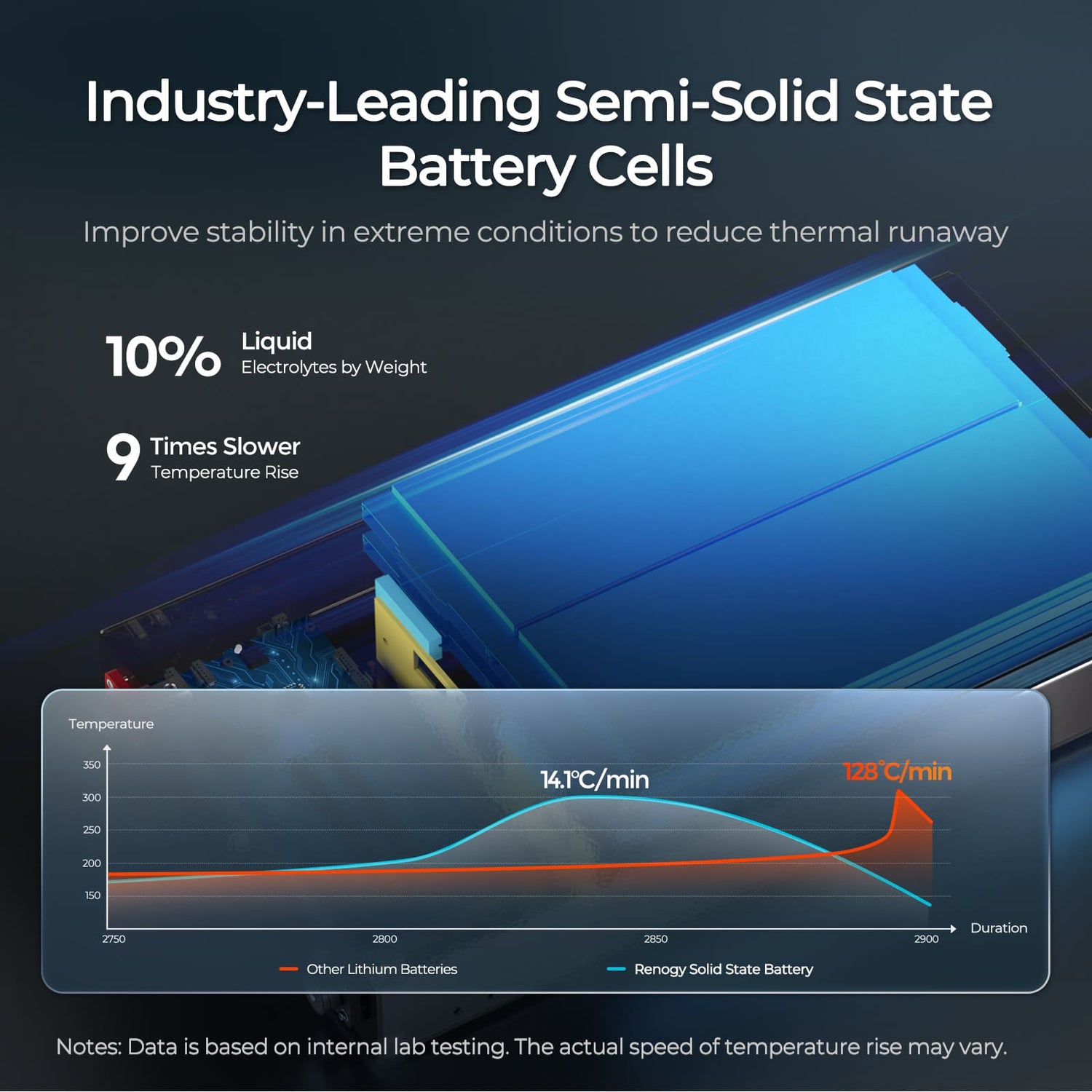 Renogy takes a step forward to introduce the solid state cells in RV batteries. By reducing liquid electrolytes by 70%, this new solid state battery brings safety and lifespan to the next level.