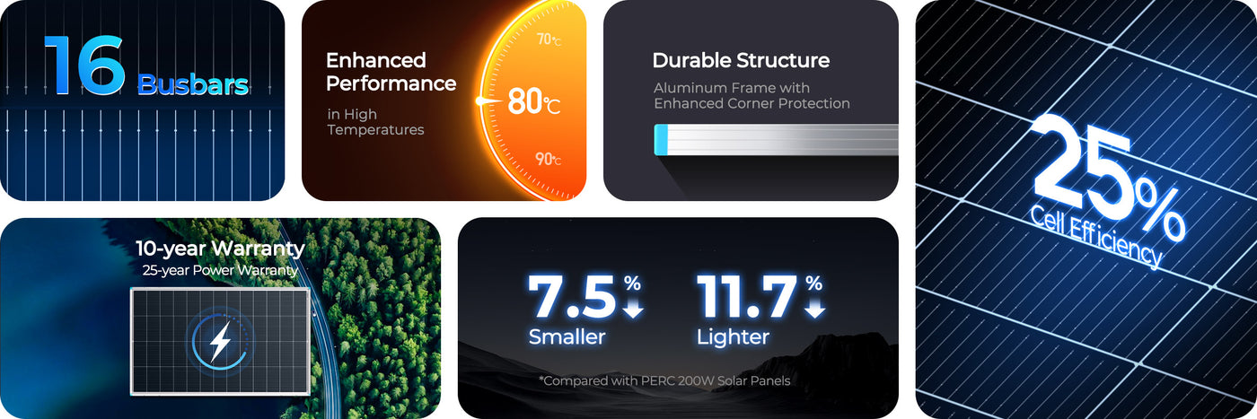 195W is our conservative rating for reliable everyday use. Thanks to advanced N-Type cells, this panel can easily hit a peak output of