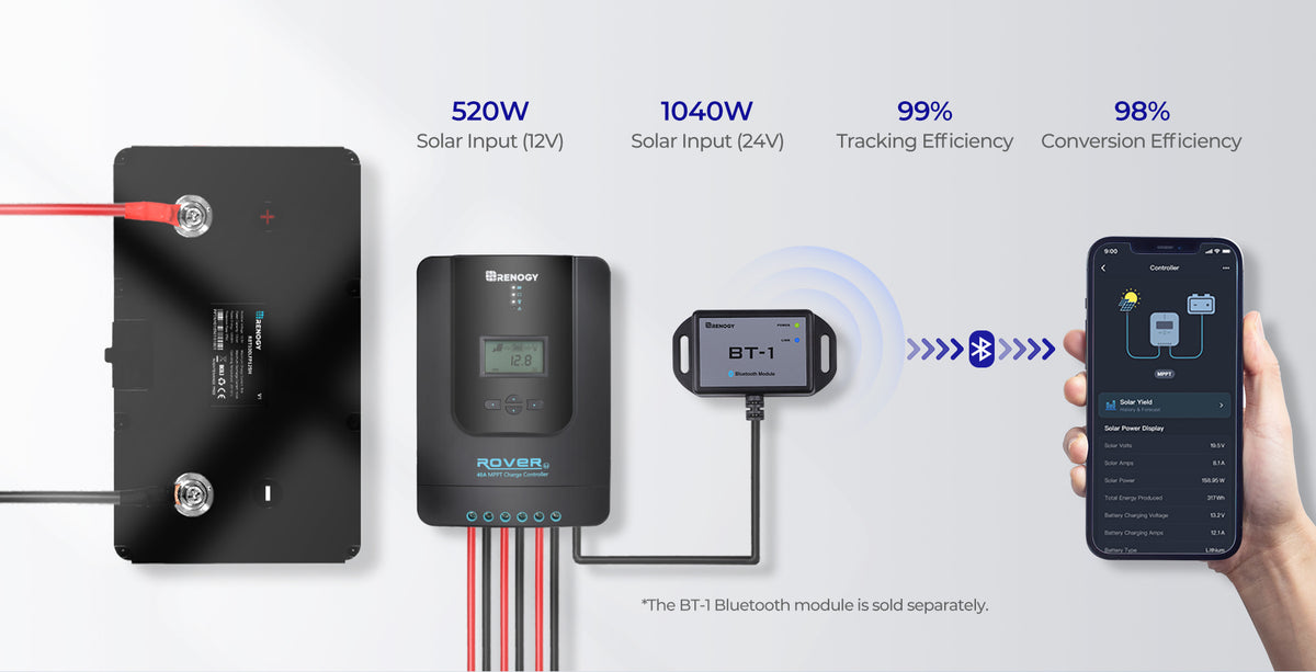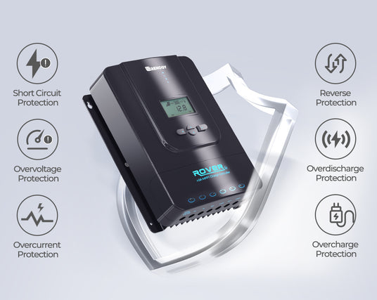 While maximizing solar harvest, the Renogy Rover 40A MPPT Solar Charge Controller actively monitors voltage & current to safeguard your batteries and system from hazards.