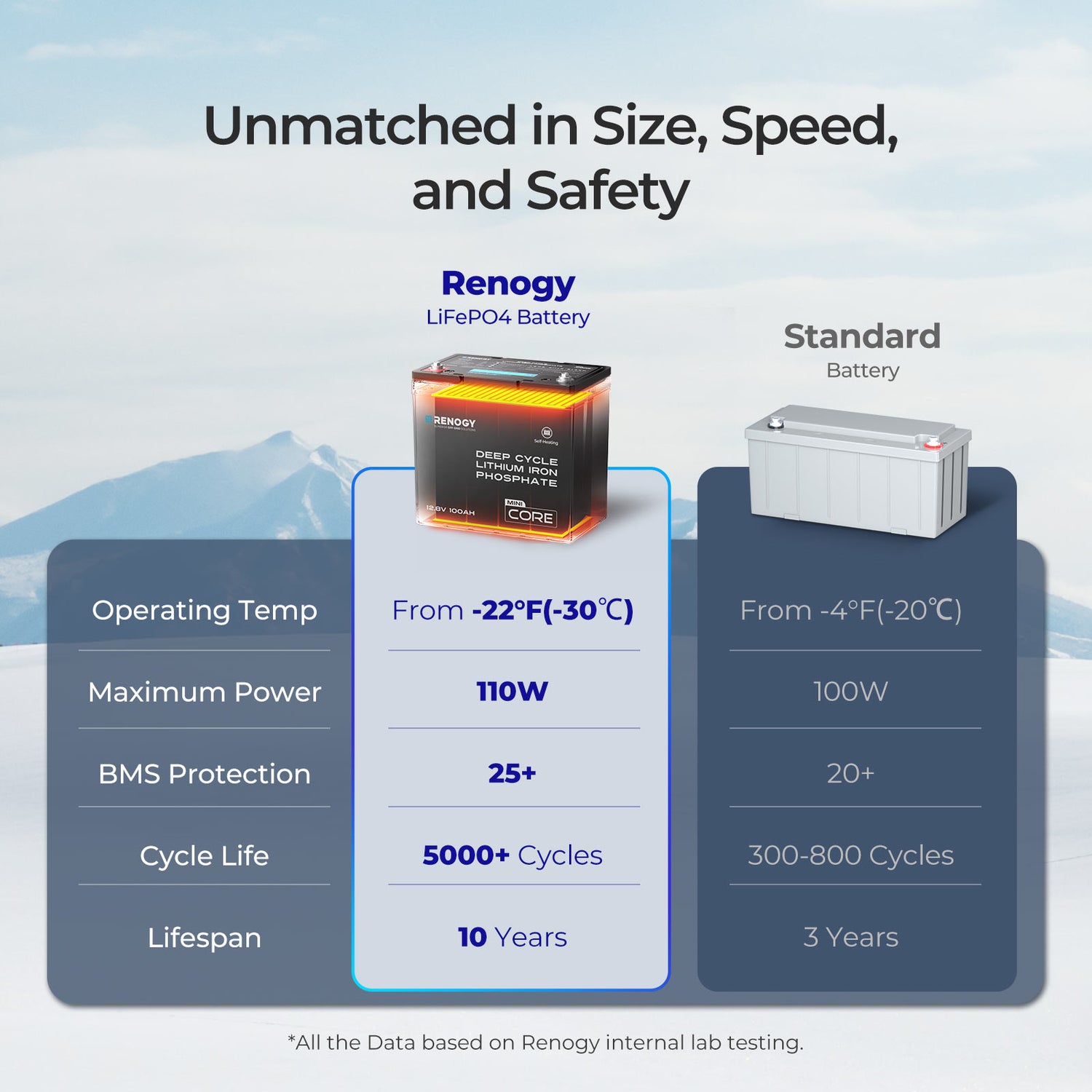 Don't let cold weather kill your batteries. Renogy's self-heating LiFePO4 batteries last far longer—10x longer than lead-acid and 1.6x longer than standard lithium—saving you from constant replacements and offering decade-long power in winter months.