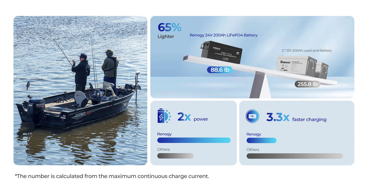 Renogy offers a lightweight 24V solution with more juice and faster charging, allowing you to effortlessly stay on the water all day.