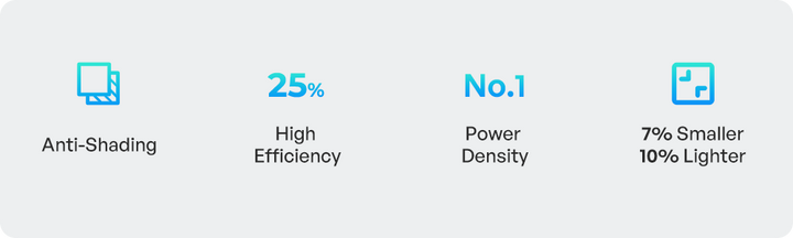 - ● 25% conversion efficiency N-Type cells with 16BB tech for superior performance in heat and low light.